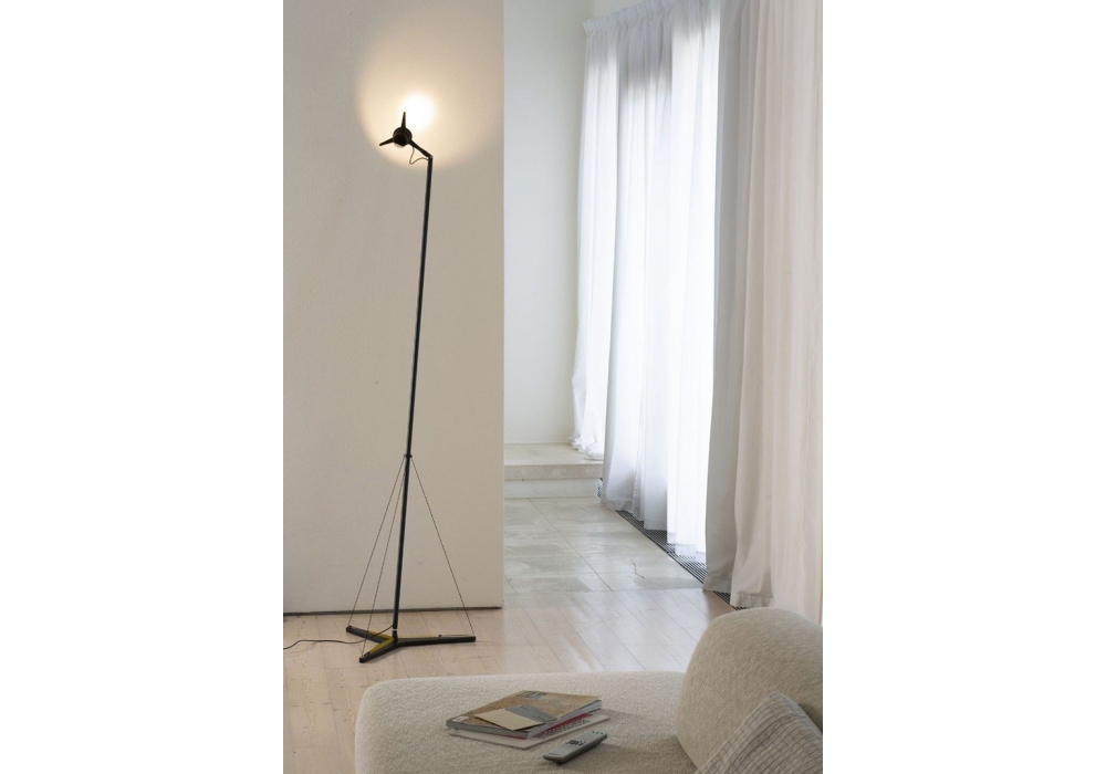 Y3 von Simon Schmitz für Martinelli Luce entworfen, ist eine Stehleuchte mit dreieckiger Stützbasis und röhrenförmigem Metallstab, der vollständig schwarz lackiert ist. Die gewählte Lichtquelle ist vom integrierten dimmbaren LED-Typ.