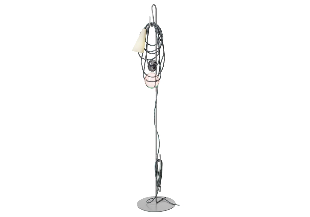 Filo von Andrea Anastasio für Foscarini entworfen, ist eine Stehleuchte mit runder Basis und tragender Struktur aus lackiertem Metall. Der Diffusor hat eine konische Form aus mundgeblasenem Glas und beherbergt eine nachrüstbare LED-Lichtquelle, die von einem Textilfaserkabel gespeist wird, das mit Dekorationen aus glasartigem Material angereichert ist. Filo ist in verschiedenen Ausführungen erhältlich.