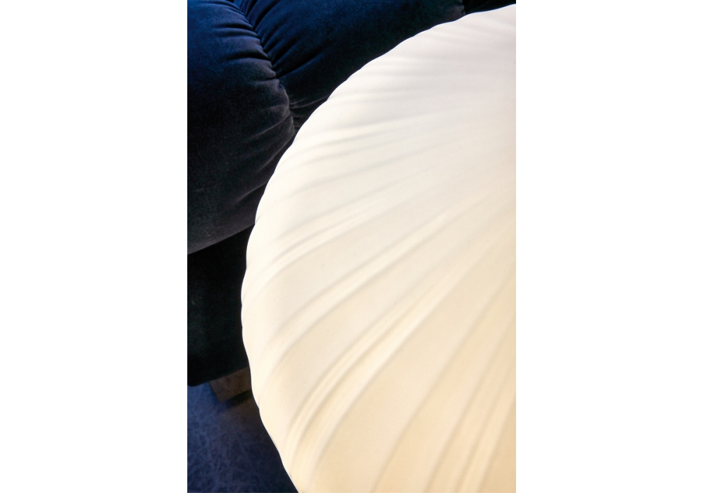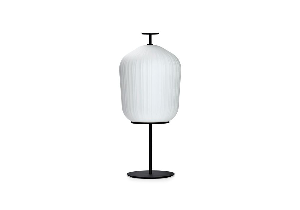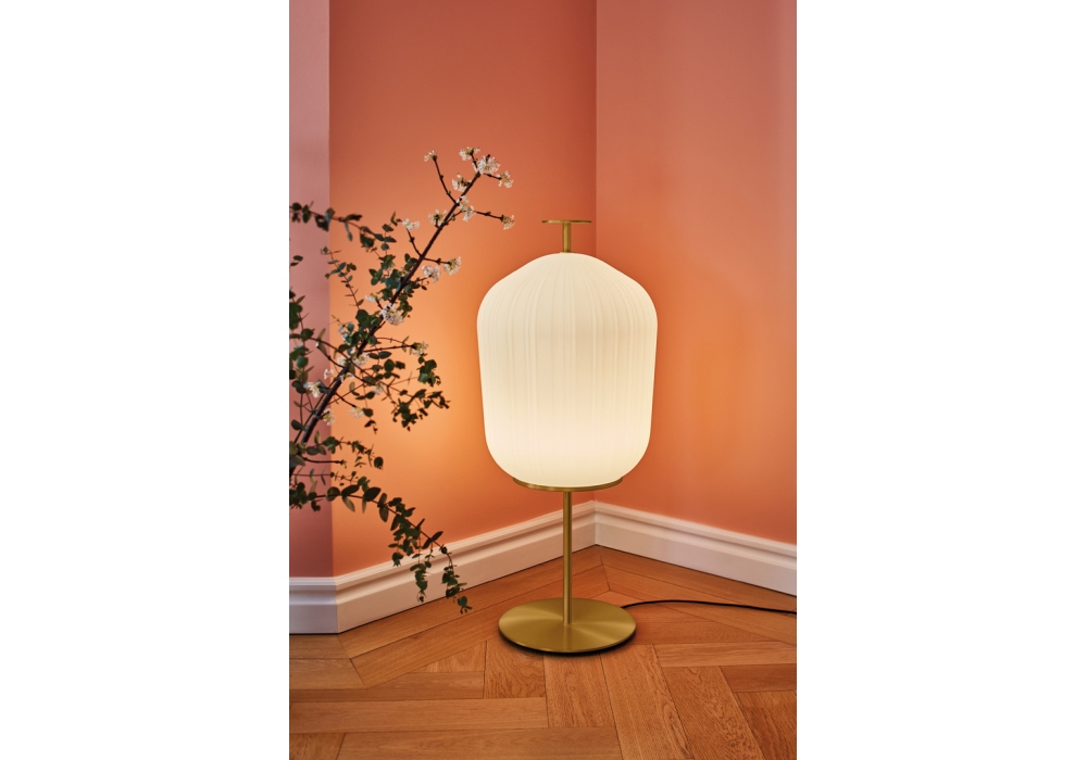 Plissée von Sebastian Herkner für ClassiCon entworfen, ist eine Stehleuchte mit Aluminiumrahmen. Mundgeblasener, weiß satinierter Opalglasschirm mit plissierter Oberfläche. Im oberen Teil des Rahmens integrierter Druckschalter. Schwarze Filzgleiter.