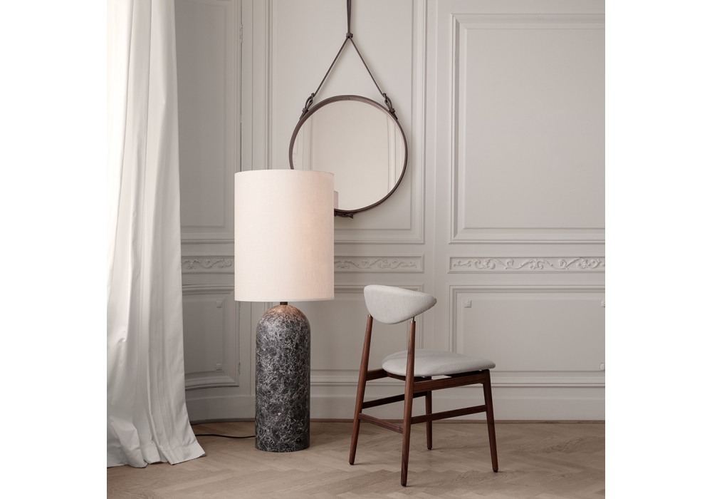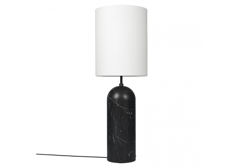 Gravity XL von Space Copenhagen für Gubi entworfen, ist eine Stehleuchte bestehend aus Marmorsockel und Lampenschirm aus Segeltuch. Es ist in zwei Größen und in verschiedenen Ausführungen erhältlich.