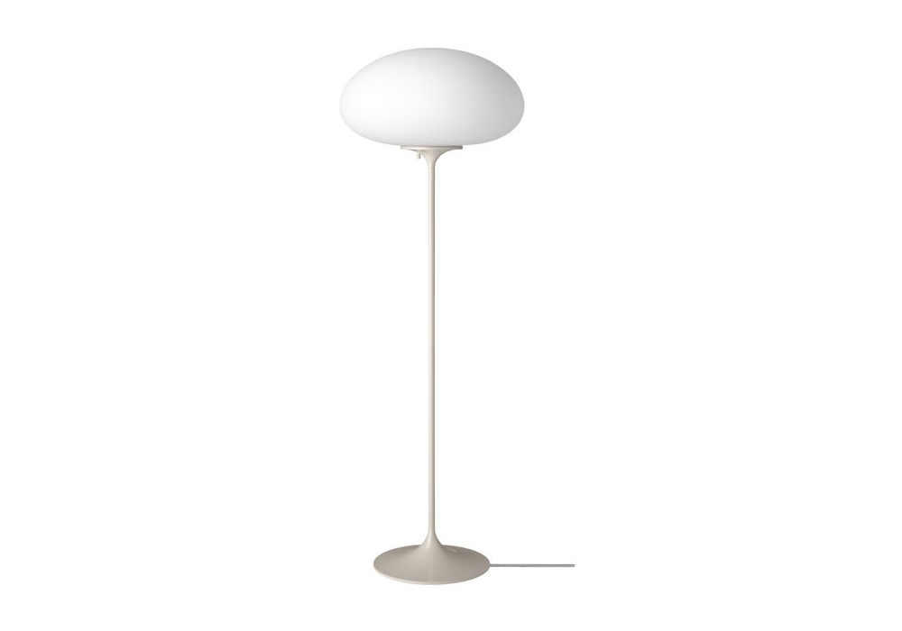 Stemlite von Bill Curry für Gubi entworfen, ist eine Stehleuchte bestehend aus Metallsockel und Milchglasschirm.