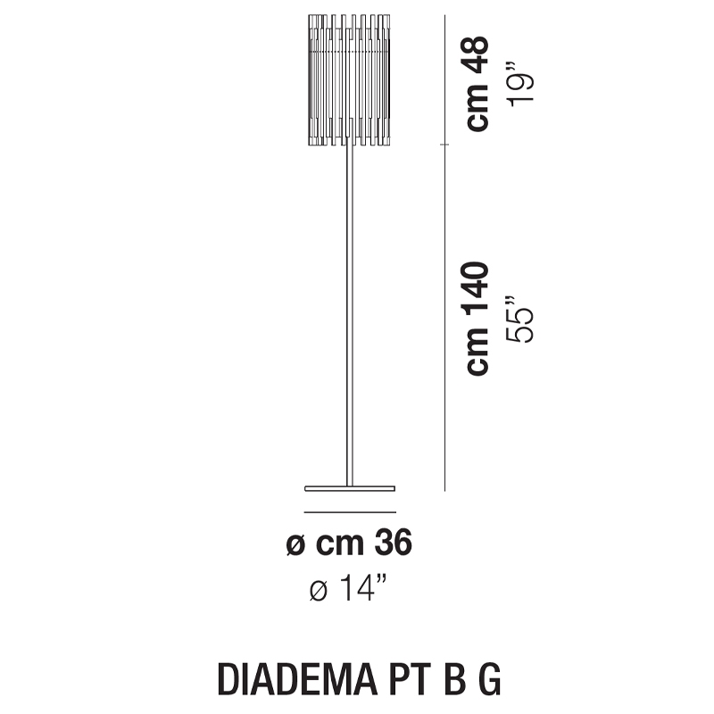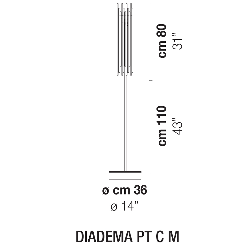 Diadema von Romani Saccani Architetti Associati für Vistosi entworfen ist eine Stehleuchte mit runder Basis und vertikalem Stab aus lackiertem Metall. Der Diffusor ist durch eine Reihe nebeneinander angeordneter röhrenförmiger Kristallelemente strukturiert und schirmt eine LED- oder Halogenlichtquelle mit G9-Anschluss ab. Diadema ist in verschiedenen Modellen und Ausführungen erhältlich.