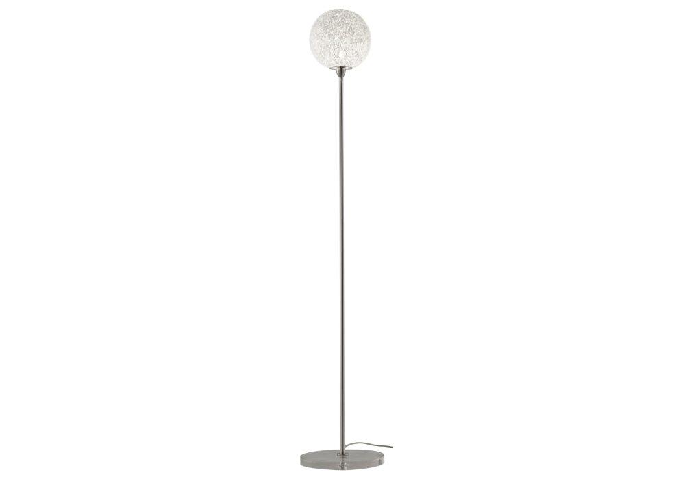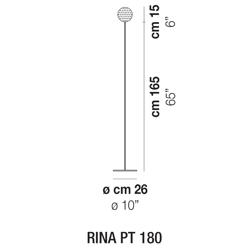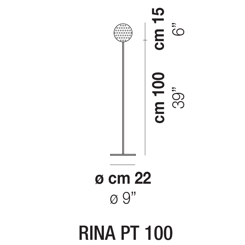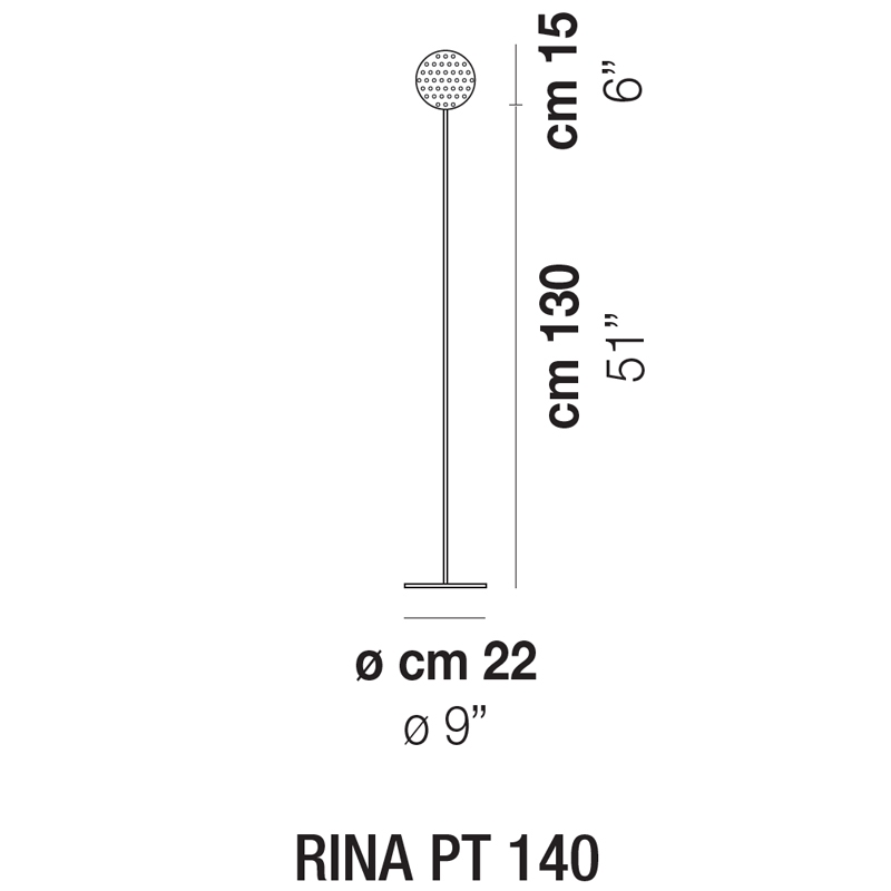 Rina von Barbara Maggiolo für Vistosi entworfen ist eine Stehleuchte mit runder Basis und vertikalem Stab in der Farbe Nickel satiniert. Der Diffusor ist kugelförmig aus weißem Murrina-Glas mit poröser Oberfläche und verwendet eine LED oder Halogen Lichtquelle vom Typ G9. Rina ist in verschiedenen Modellen erhältlich.