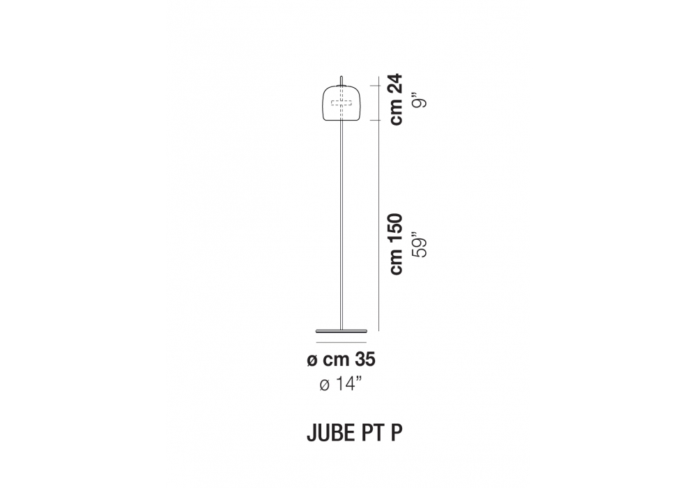 Jube von Favaretto & Partners für Vistosi entworfen, ist eine Stehleuchte mit Metall-Tragstruktur und rundem Fuß in satiniertem Gold und satiniertem Stahl. Der Diffusor besteht aus mundgeblasenem Glas in verschiedenen Ausführungen und enthält eine dimmbare LED-Lichtquelle.