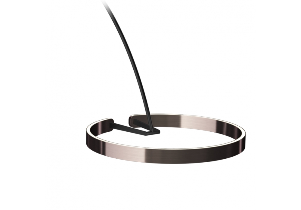 Mito Largo von Occhio entworfen, ist eine höhenverstellbare LED-Stehleuchte mit Diffusor aus lackiertem Aluminium mit PVD-Beschichtung und optischem Silikon, Körper aus Carbon und Sockel aus lackiertem Stahl. Auf und ab verblassen. Erhältlich mit integrierter Bluetooth-Steuerung oder mit Fernbedienung. Occhio air App im App Store oder Google Play Store erhältlich.
