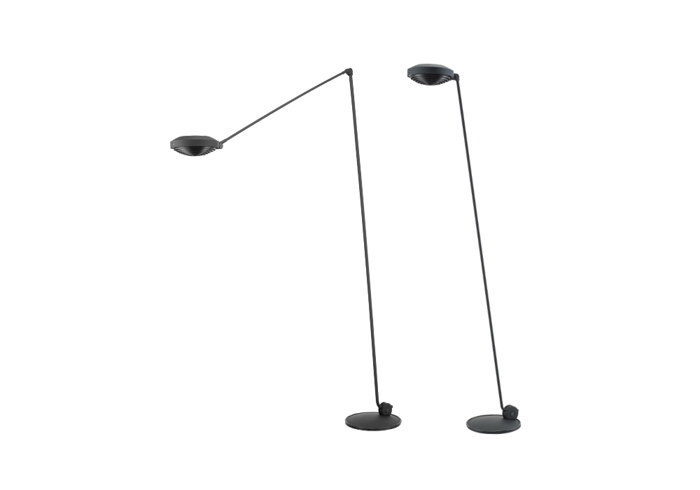 Elle, von Tommaso Cimini für Lumina entworfen, ist eine Stehleuchte mit Struktur aus Aluminium und Stahl mit beweglichen Armen und runder Basis. Der Diffusor ist vertikal um 180 ° verstellbar und nimmt eine Halogenlichtquelle auf. Elle ist in verschiedenen Ausführungen und Modellen erhältlich.