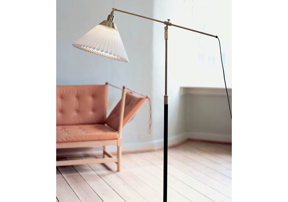 349 von Aage Petersen für Le Klint entworfen, ist eine Stehleuchte, die aus einer Kombination von Messing, Papier und Kunststoffmaterial besteht. Die Struktur besteht aus einem runden Metallsockel mit Messingdetails. Die vertikale Stange ist teleskopierbar, um ihre Höhe anzupassen, während die horizontale Stange dank eines Kugelstifts aus Messing in Verlängerung und Winkel eingestellt werden kann. Der kegelförmige Lampenschirm ist aus Papier oder Kunststoff gefertigt und an einem Messinggelenk verankert. Die verwendete Lichtquelle ist LED oder Halogen (nicht im Lieferumfang enthalten). 349 ist mit Diffusor aus Kunststoff oder edlem Papier erhältlich.