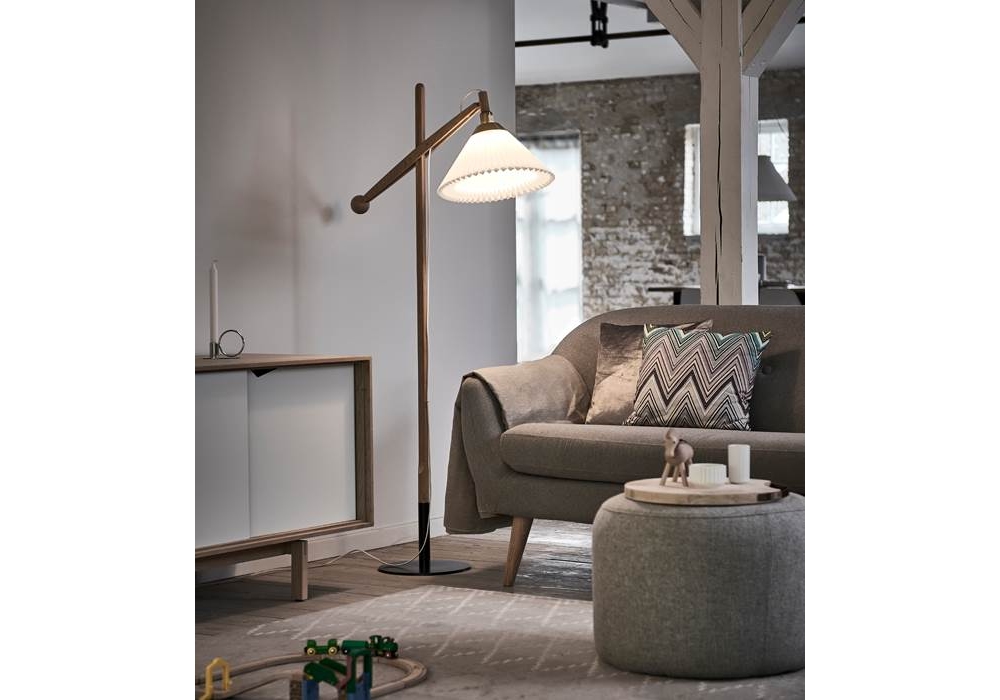 325 von Vilhelm Wohlert für Le Klint entworfen, ist eine Stehleuchte, die aus der Kombination von Metall, Eichenholz, Papier und Kunststoff besteht. Die Struktur besteht aus einem runden Metallsockel und zwei Eichenholzstangen, von denen eine vertikal auf der Basis untergebracht ist und eine andere horizontal, auf der der Lampenschirm platziert ist. Der Lampenschirm besteht aus Kunststoff oder Papier, wird von einer Messingstruktur getragen und nimmt eine LED- oder Halogenlichtquelle auf (nicht im Lieferumfang enthalten). 325 ist mit Diffusor aus Kunststoff oder edlem Papier erhältlich.