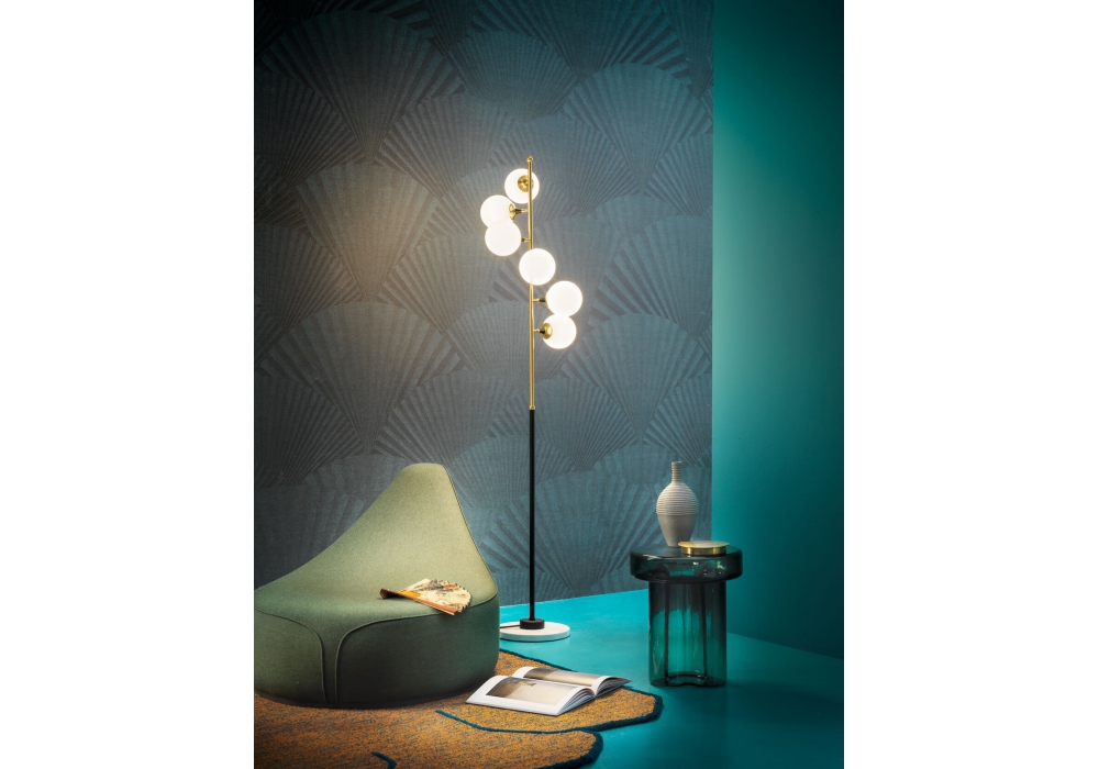 Galassia, entworfen und hergestellt von Stilnovo, ist eine LED-Stehleuchte, die durch die Kombination von Metall, Marmor und Glas strukturiert ist. Der Sockel ist rund aus weißem Carrara-Marmor mit einem Lampenkörper aus schwarzem Metall/Messing und galvanischer Vergoldung. Die Diffusoren sind kugelförmig aus weißem Triplex-Glas.