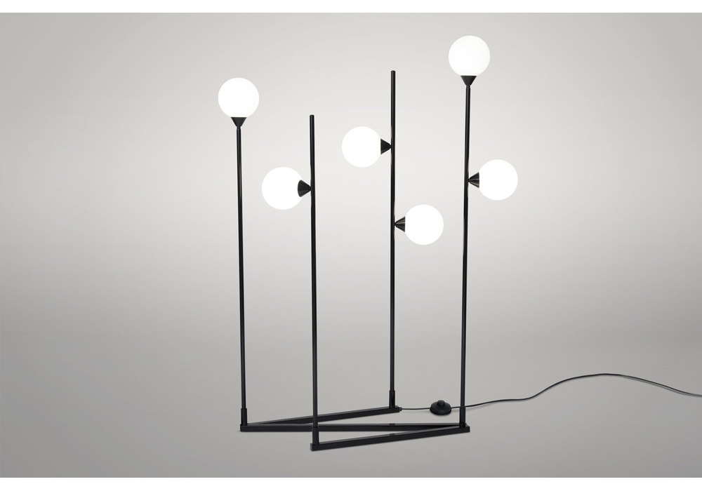 Tube and Sphere von Atelier Areti entworfen, ist eine Stehlampe aus schwarz oder weiß lackiertem Metall. Leuchtende weiße Glaskugeln.
