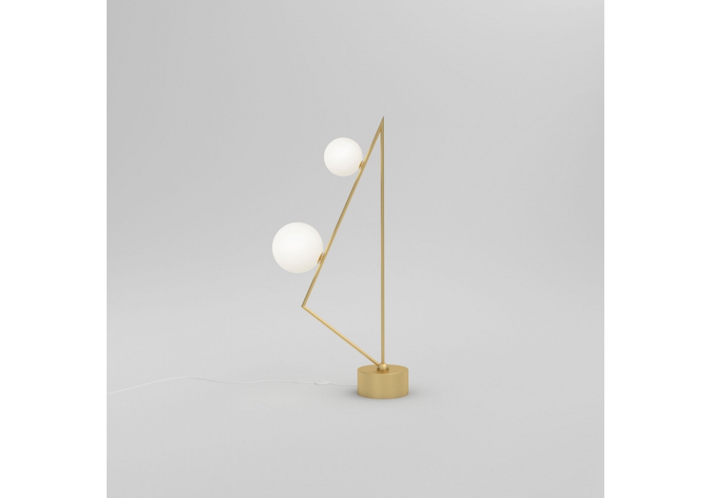 Triangle 2 von Atelier Areti entworfen, ist eine Stehleuchte, die aus einer Struktur aus gebürstetem Messing und zwei weißen Glasdiffusoren besteht.