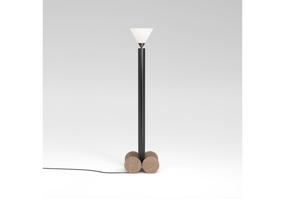Wheels von Atelier Areti entworfen, ist eine Stehleuchte, die aus einem Holzsockel, einer schwarz oder weiß lackierten Metallstruktur und einem weißen Glaskegel besteht.