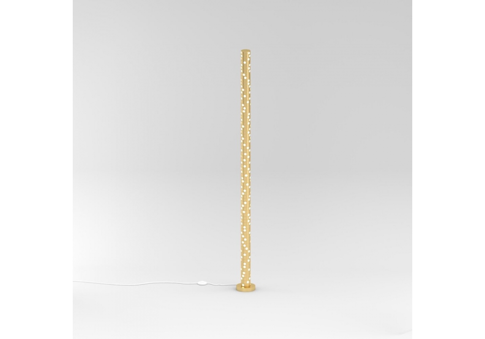 Discs Stacks von Atelier Areti entworfen, ist eine Stehleuchte aus gebürstetem Messing und weißen Acrylplatten.
