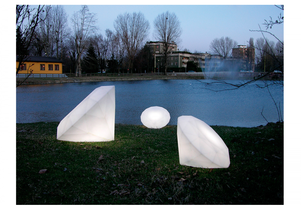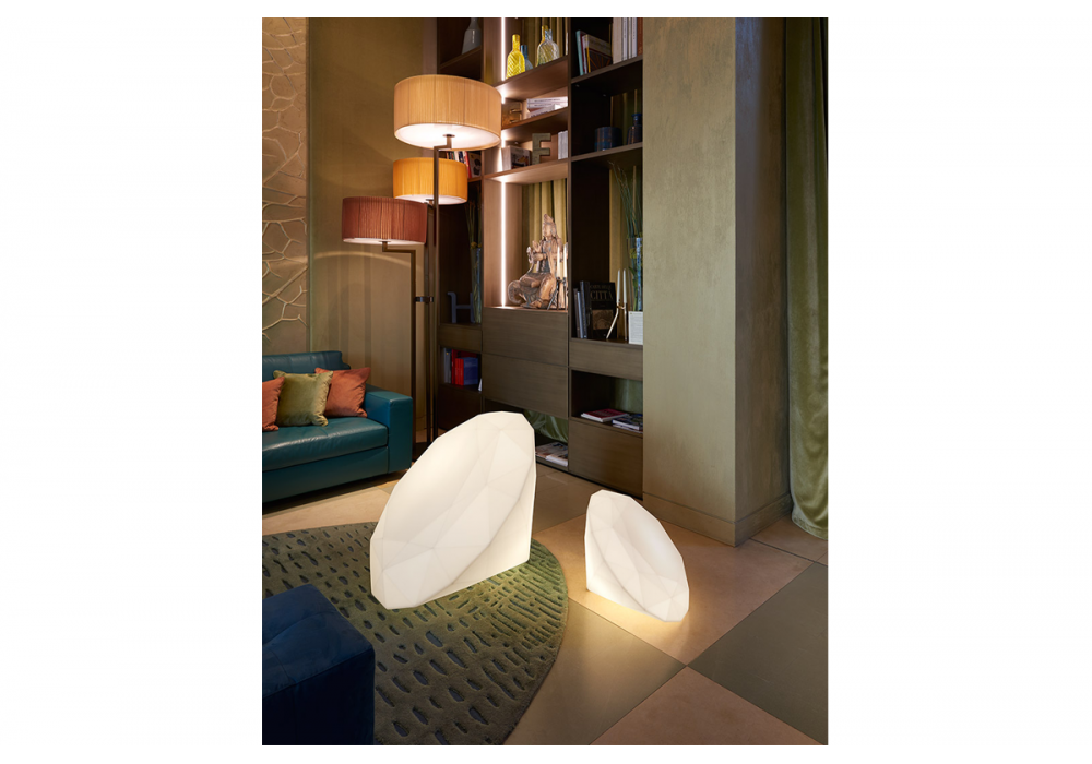 Bijoux, entworfen von Buro Fur Form, ist eine Stehleuchte aus Polyethylen, die an die Form eines Diamanten erinnert: Das diffuse Licht, das sie ausstrahlt, macht sie zu einem Brillanten, der Innen- und Außenbereiche verschönert. Erhältlich in 2 Größen