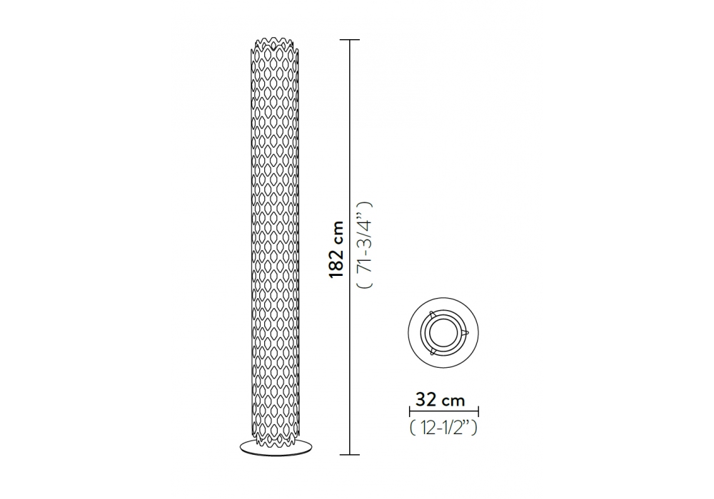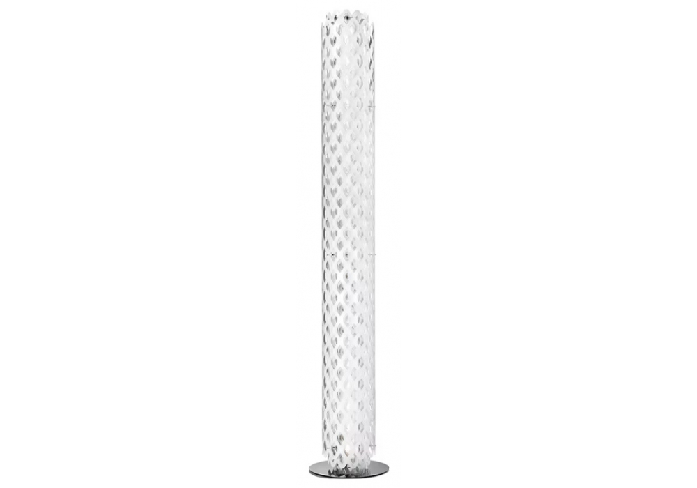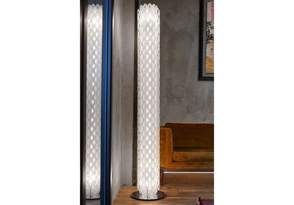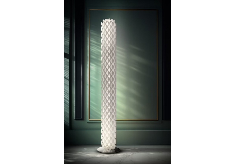 Charlotte von Doriana und Massimiliano Fuksas für Slamp entworfen, ist eine Stehleuchte mit rundem Sockel aus Edelstahl. Der Diffusor hat eine zylindrische Form, ist aus Cristlaflex® und Lentiflex® perforiert und schirmt eine dimmbare LED-Filament-Lichtquelle ab.