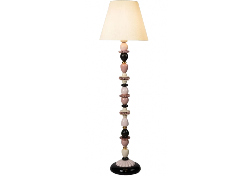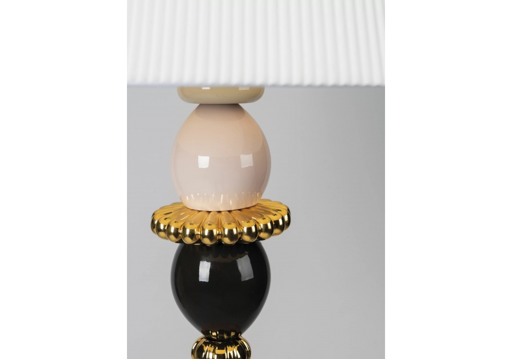 Firefly von Dept. Diseño y Decoración für Lladró entworfen, ist eine Stehleuchte. Der Lampenkörper besteht aus glänzendem Porzellan mit Details in verschiedenen Farben, während der Lampenschirm aus Stoff besteht. Firefly ist mit einem USB-Anschluss zum Aufladen ausgestattet.