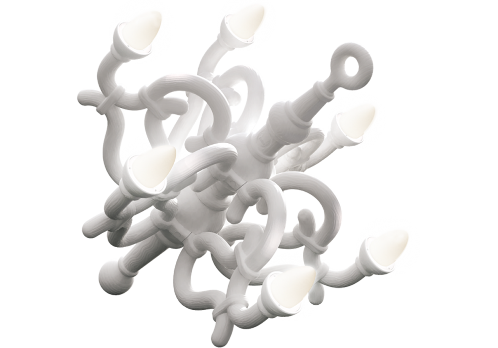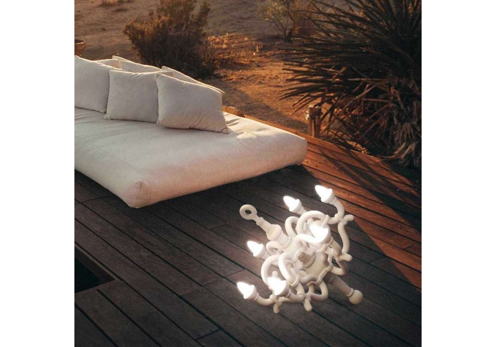 Fallen Chandelier von Studio Job für Qeeboo entworfen, ist eine Stehleuchte, die vollständig aus Polyethylen oder Fiberglas in verschiedenen Ausführungen besteht. Die verwendete Lichtquelle ist vom Typ LED mit Weißabstufung. Fallen Chandelier ist in zwei verschiedenen Versionen erhältlich, die M-Version ist wiederaufladbar, während die XL-Version mit einer Steckdose ausgestattet ist.