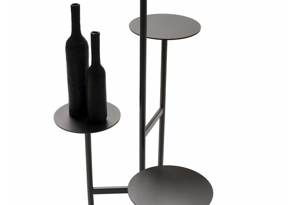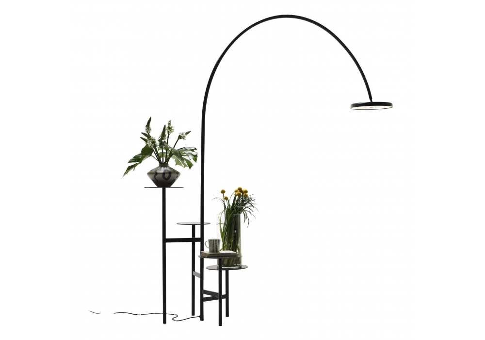 Ikebana von Uto Balmoral für Mogg entworfen, ist eine dimmbare LED-Stehleuchte aus mattschwarz lackiertem Metall. Verfügbar in 2 Versionen: Bodenversion mit Doppellicht und 3 Regalen; Arc-Version mit LED-Platte und 4 Regalen.