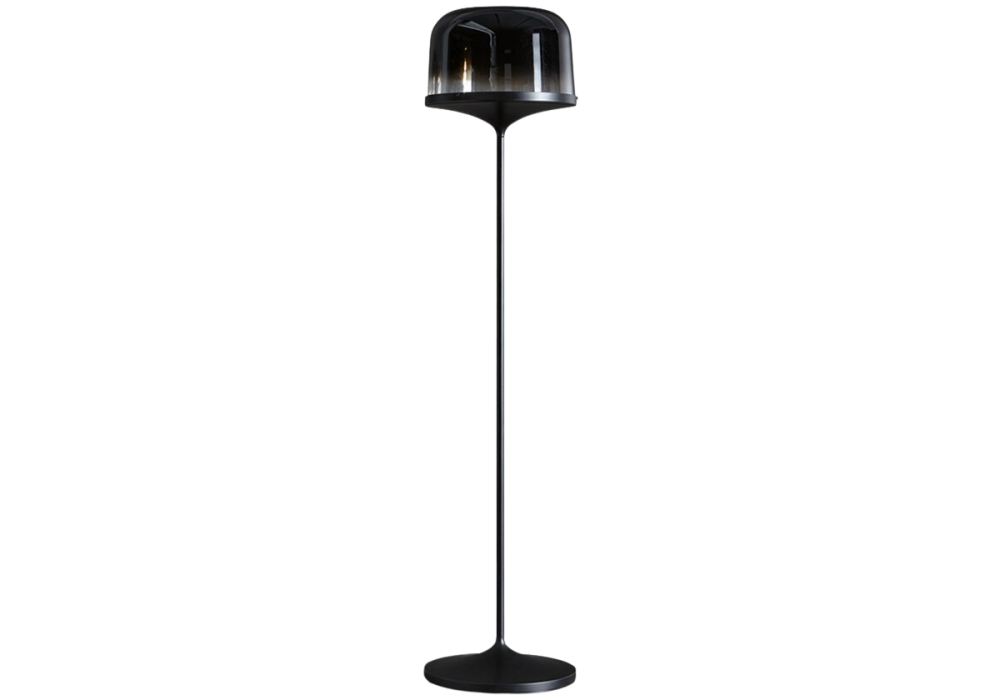Pin von Dondoli e Pocci für Bonaldo entworfen, ist eine dimmbare LED-Stehleuchte mit Lampenschirm aus Rauchglas und bleifarbener Metallstruktur.