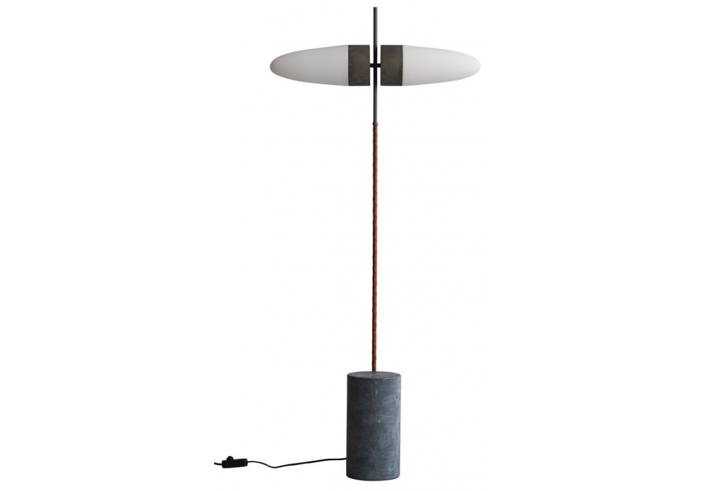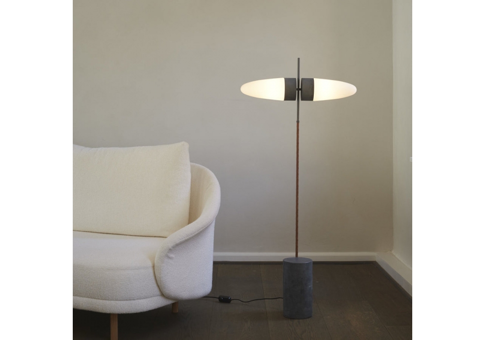 Bull von Kristian Sofus Hansen & Tommy Hyldahl für 101 Copenhagen entworfen, ist eine Stehleuchte mit Basis aus unpoliertem grauem Marmor, Arm aus oxidiertem Aluminium mit cognacfarbenem Leder und Oberteil aus oxidiertem Aluminium. Lampenschirm aus klarem, durchscheinendem Glas.