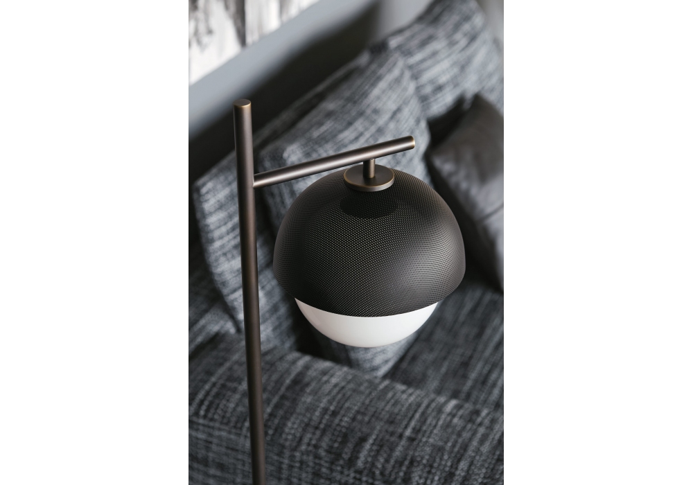 Urban 1 von Massimo Tonetto für Venicem entworfen, ist eine Stehleuchte mit diffusem Licht. Struktur aus hell oder dunkel brüniertem Messing mit Lampenschirm aus perforiertem Metall in mattem Gold oder mattem Schwarz. Diffusor aus weißem mundgeblasenem Muranoglas.
