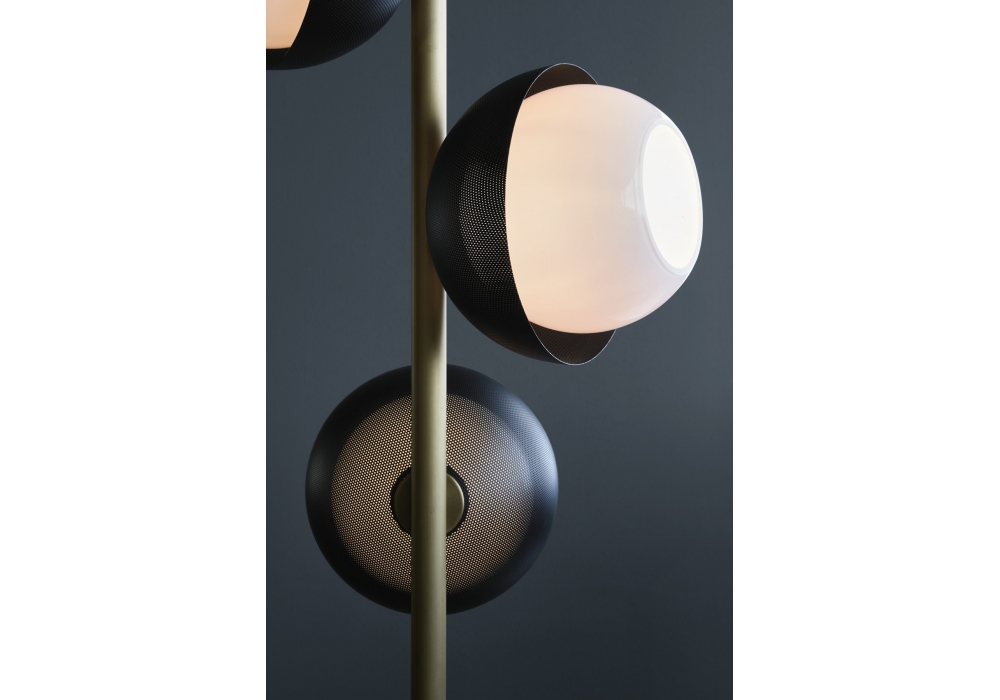 Urban 3 von Massimo Tonetto für Venicem entworfen, ist eine Stehleuchte mit diffusem Licht. Struktur aus hell oder dunkel brüniertem Messing mit Lampenschirm aus perforiertem Metall in mattem Gold oder mattem Schwarz. Diffusor aus weißem mundgeblasenem Muranoglas.