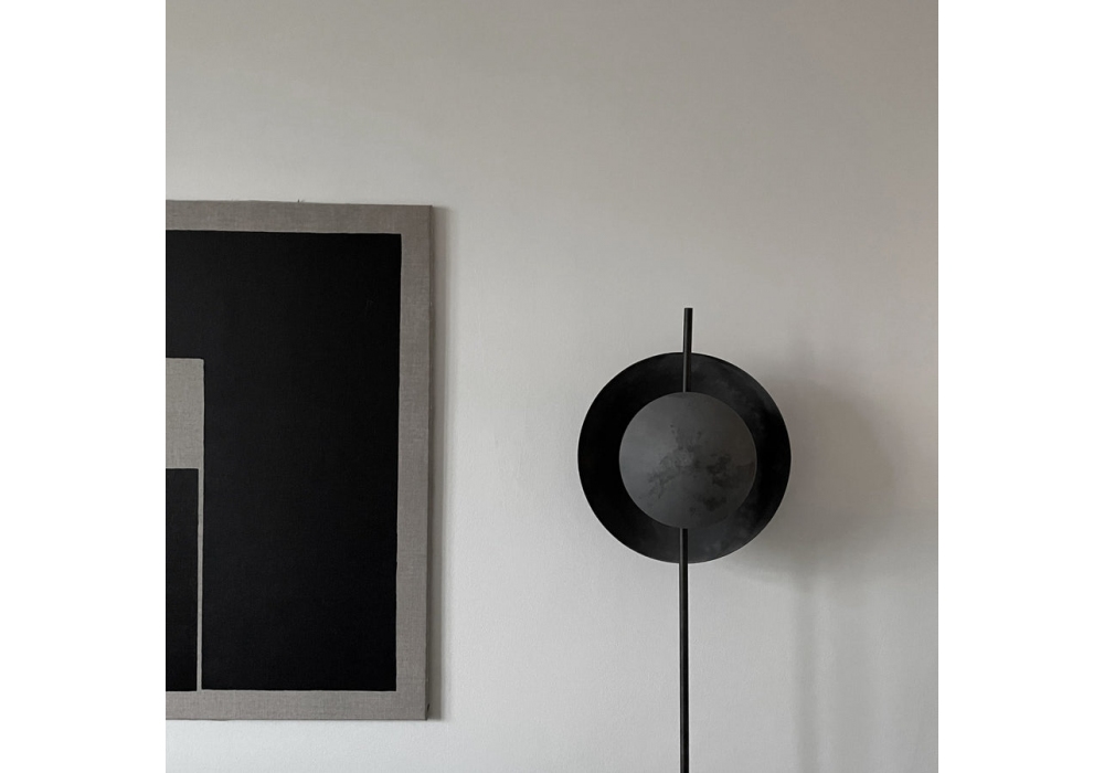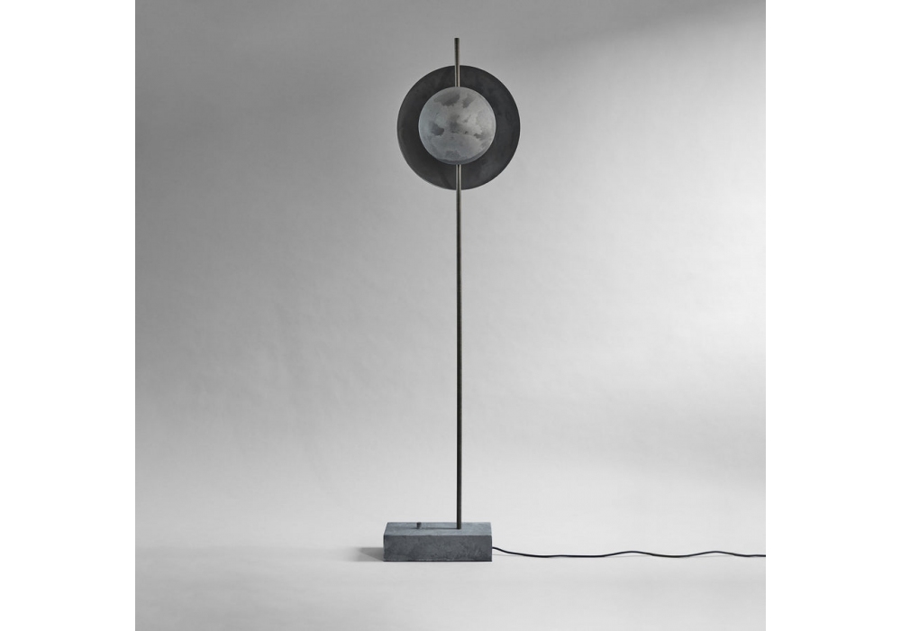 Dawn von Nicolaj Nøddesbo & Tommy Hyldahl für 101 Copenhagen entworfen, ist eine Stehleuchte, die sich durch eine quadratische Basis und einen oberen Teil aus zwei abgerundeten Lampenschirmen aus oxidiertem Aluminium auszeichnet.