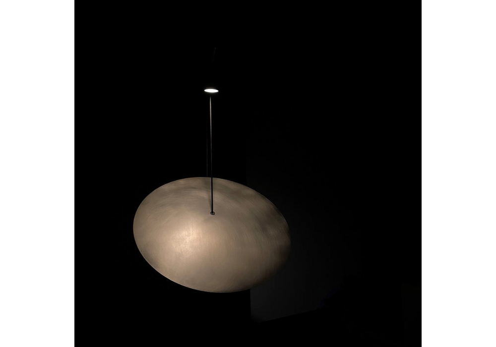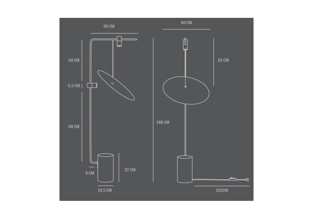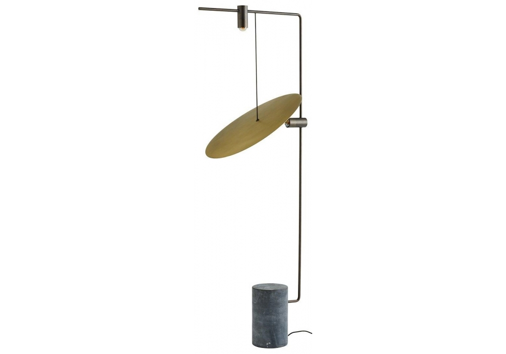 The Moon von Kristian Sofus Hansen & Tommy Hyldahl für 101 Copenhagen entworfene, ist eine Stehleuchte, die sich durch einen Lampenschirm aus gebürstetem Messing, einen Arm aus oxidiertem Messing und einen zylindrischen Sockel aus unpoliertem grauem Marmor auszeichnet. Die Lampe hat zwei Lichtquellen.