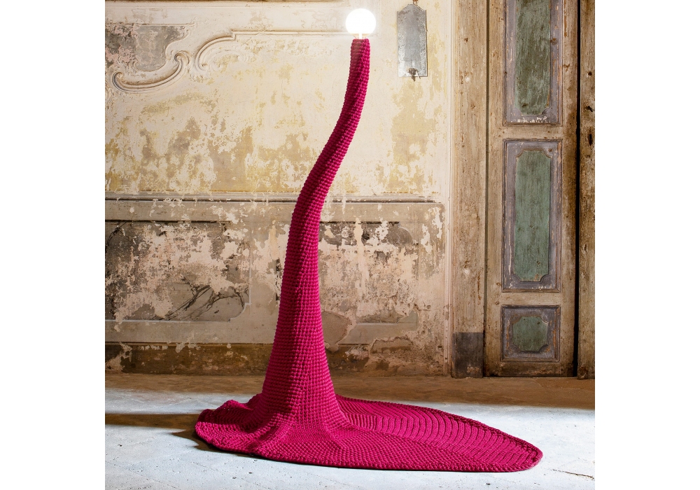 Penelope, von Domenico Rinaldi für Fisionarte entworfen, ist eine Stehleuchte mit tragender Struktur aus schwarz lackiertem, handgewebtem Metallgeflecht. Polsterung aus feuerhemmendem gehäkeltem Stoff. Penelope ist in verschiedenen Ausführungen und mit oder ohne Lichtquelle erhältlich.