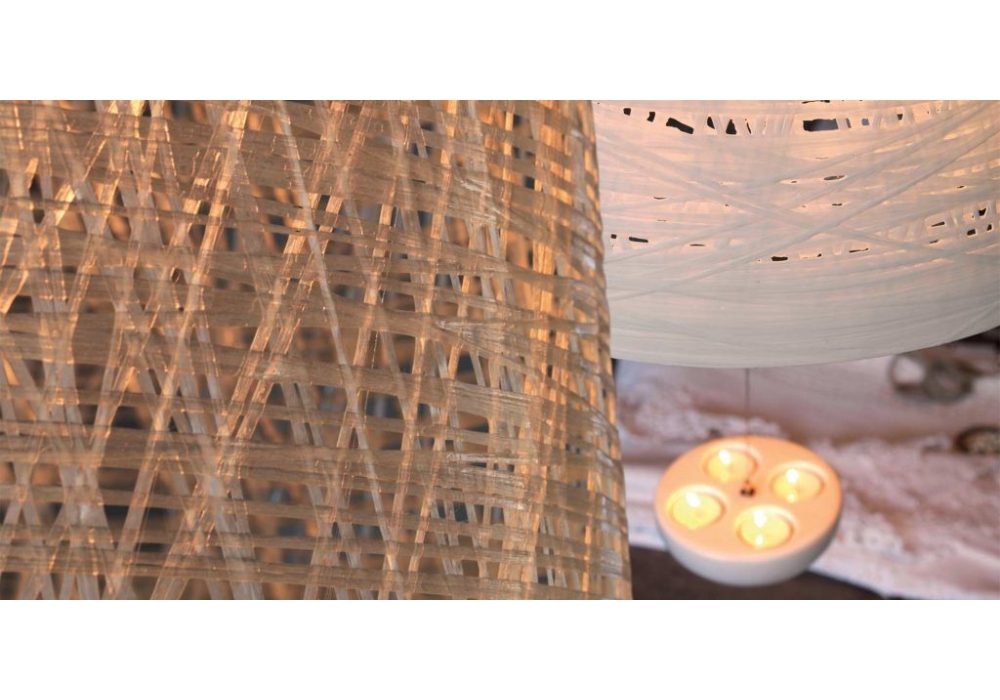 Black Out von Matteo Ugolini für Karman entworfen, ist eine Stehlampe mit mattweißer Metallstruktur und transparentem oder weißem Glasfaser-Filamentschirm. Glühbirne nicht enthalten.
