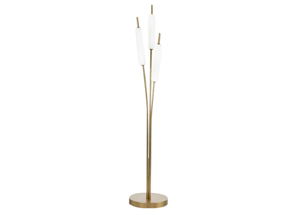 Typha von Brambilla Calvi für Il Fanale entworfen ist eine Stehleuchte mit Sockel und gebogenen Stäben aus natürlichem Messing. Die Diffusoren bestehen aus Borosilikatglas und schirmen die dimmbaren LED-Lichtquellen ab.