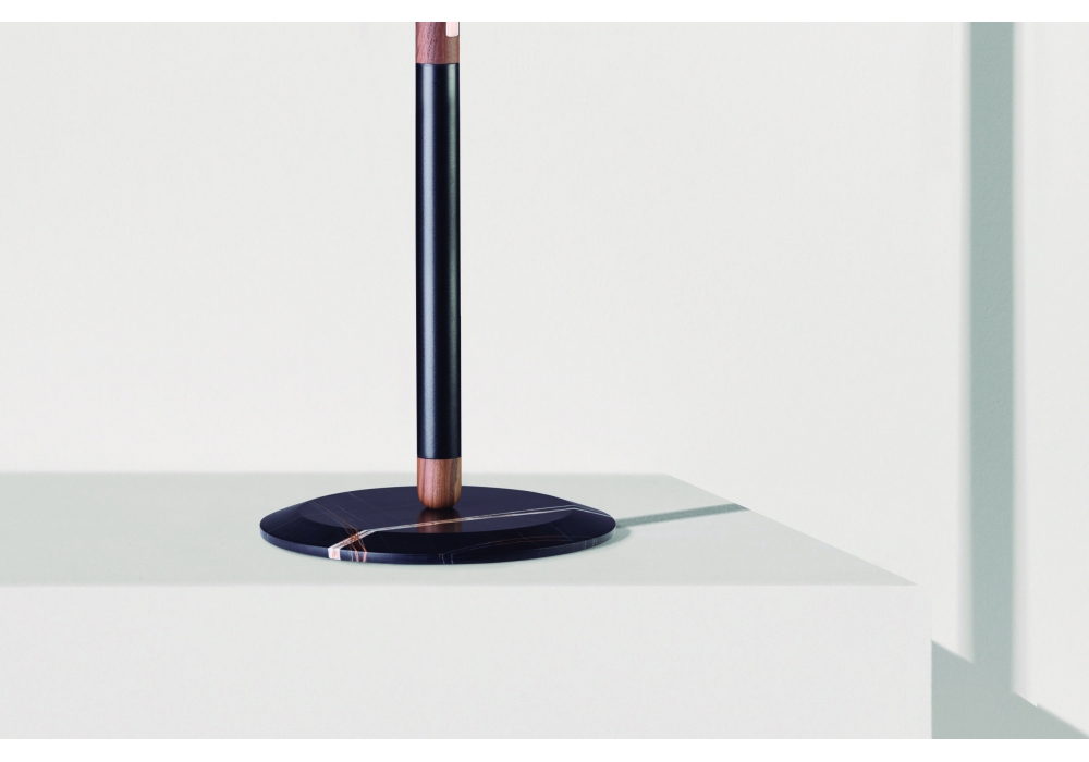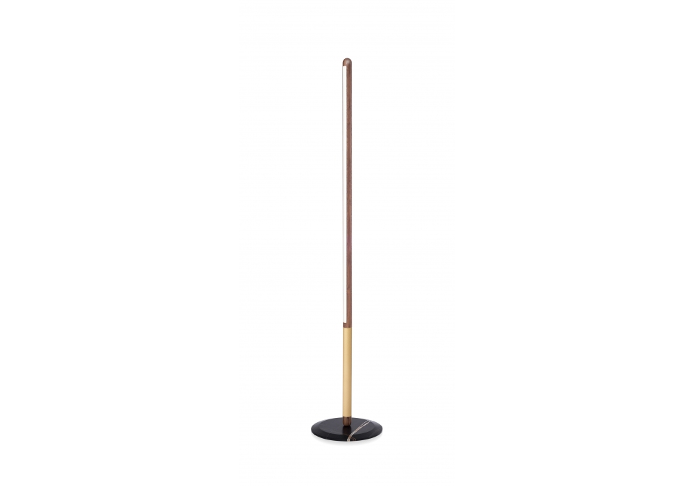 Linea Uno von Andrés Martínez für Nomon entworfen, ist eine Stehleuchte mit Struktur aus Walnussholz, mit Details aus poliertem Messing oder Metall mit Graphit-Finish und Sockel aus Sahara-Marmor.