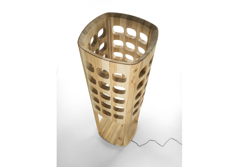 Forella von Michele De Lucchi für Riva 1920 entworfen, ist eine Stehleuchte aus Massivholz. Das Spiel von Voll- und Hohlräumen lässt Licht dank LED-Streifen durch das Holz filtern.