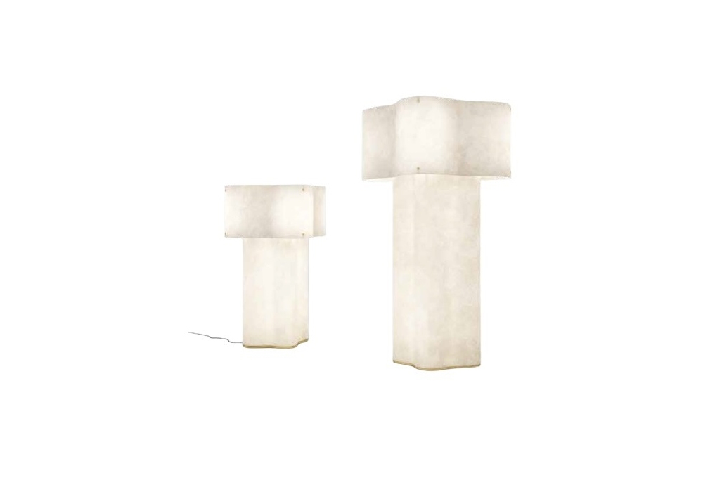 Nuvola von Draga & Auriel für Baxter entworfen, ist eine Stehleuchte mit Lampenschirm aus Fiberglas. Rahmen und Details aus mattmessingbeschichtetem Metall mit mattem Lack. Lampe mit LED-Lichtquelle. Verfügbar in 2 Größen.