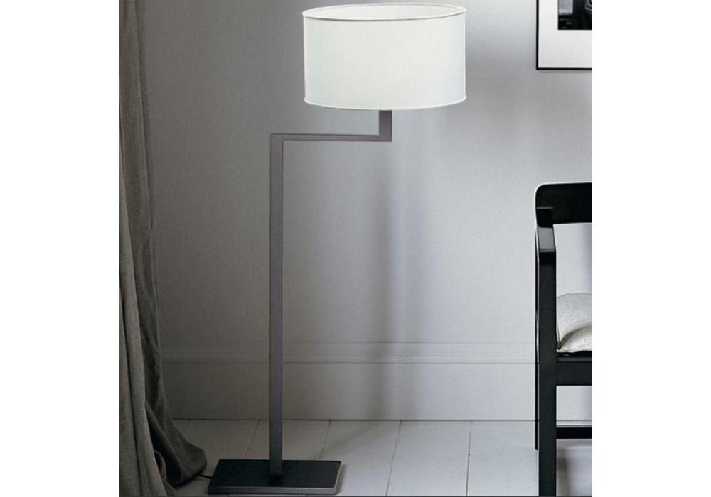 Jackie von Massimiliano Raggi für Casamilano entworfen, ist eine Stehleuchte mit brünierter lackierter Metallstruktur und einem Lampenschirm, der mit milchig weißem Stoff und PVC bezogen ist. Elektrokabel aus PVC.