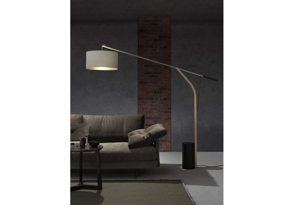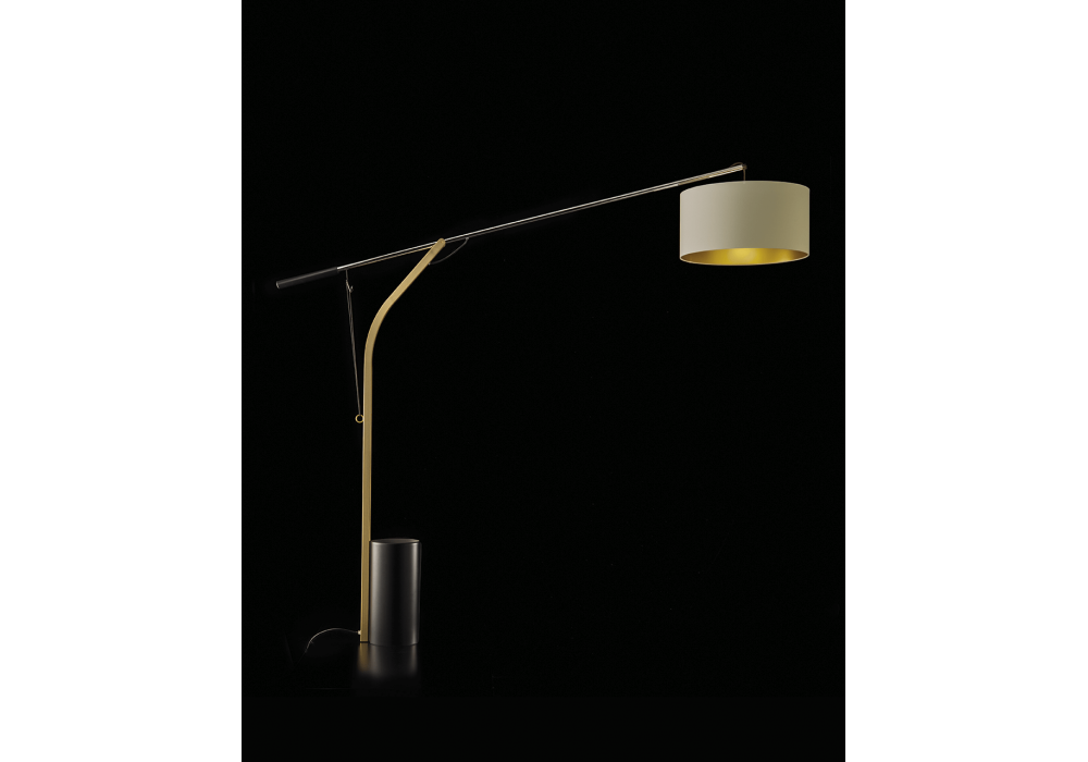Aria von Stefano Traverso für Italamp entworfen, ist eine LED-Stehleuchte mit höhenverstellbarem Arm. Zylindrischer Sockel aus mattschwarzem Metall, Stiel aus gebürstetem Gold und Chromständer. Lampenschirm aus elfenbeinfarbenem Stoff mit goldener Innenseite.