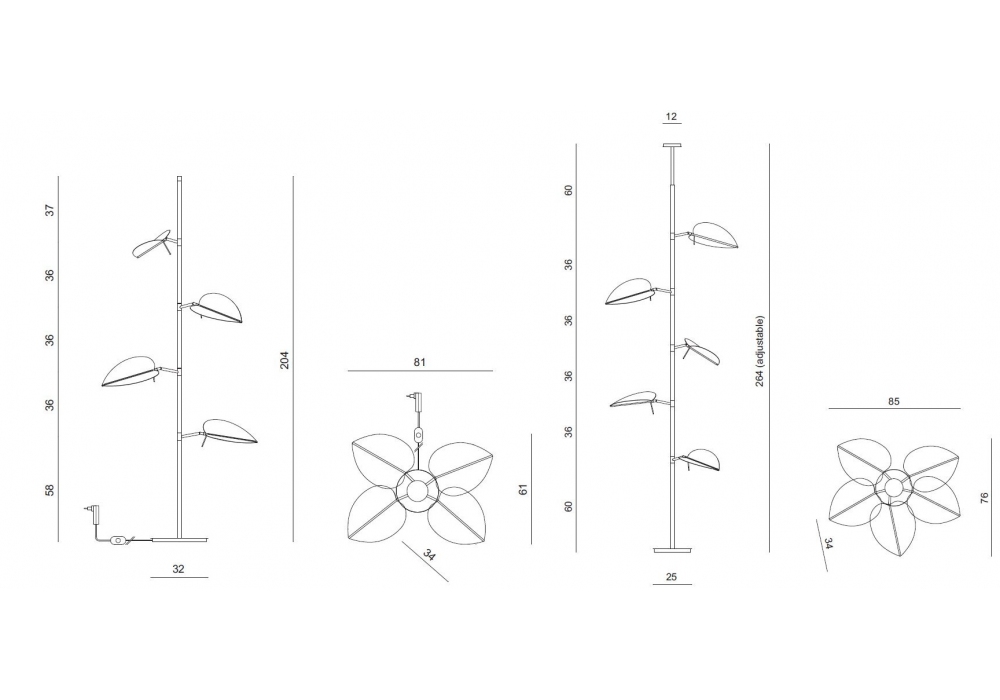 Aracea von Gupica für Visionnaire entworfen ist eine Stehleuchte mit rundem Sockel und vertikalem Stab aus lackiertem Stahl. Die Diffusoren sind blattförmig und können sowohl gedreht als auch geneigt werden, um das Licht nach Wunsch zu streuen. Im mittleren Teil jedes Blattes befindet sich eine hocheffiziente lineare LED-Lichtquelle. Aracea ist in verschiedenen Modellen und Ausführungen erhältlich.
