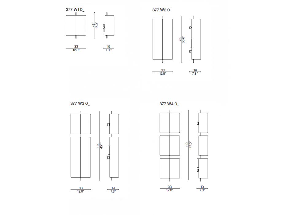 | Abmessungen | I_ 33 x 19 x H 43 cm; II_ 33 x 19 x H 78 cm; III_ 33 x 19 x H 114 cm; IV_ 33 x 19 x H 119 cm. |