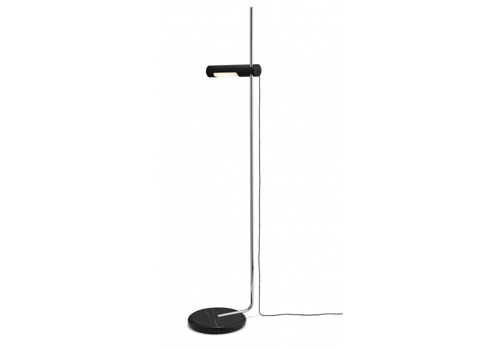 Alola von Angelo Mangiarotti für Karakter entworfen, ist eine Stehleuchte mit Sockel aus Nero Marquina-Marmor, Stiel aus verchromtem oder pulverbeschichtetem Stahl und Lampenkopf aus pulverbeschichtetem Aluminium.
