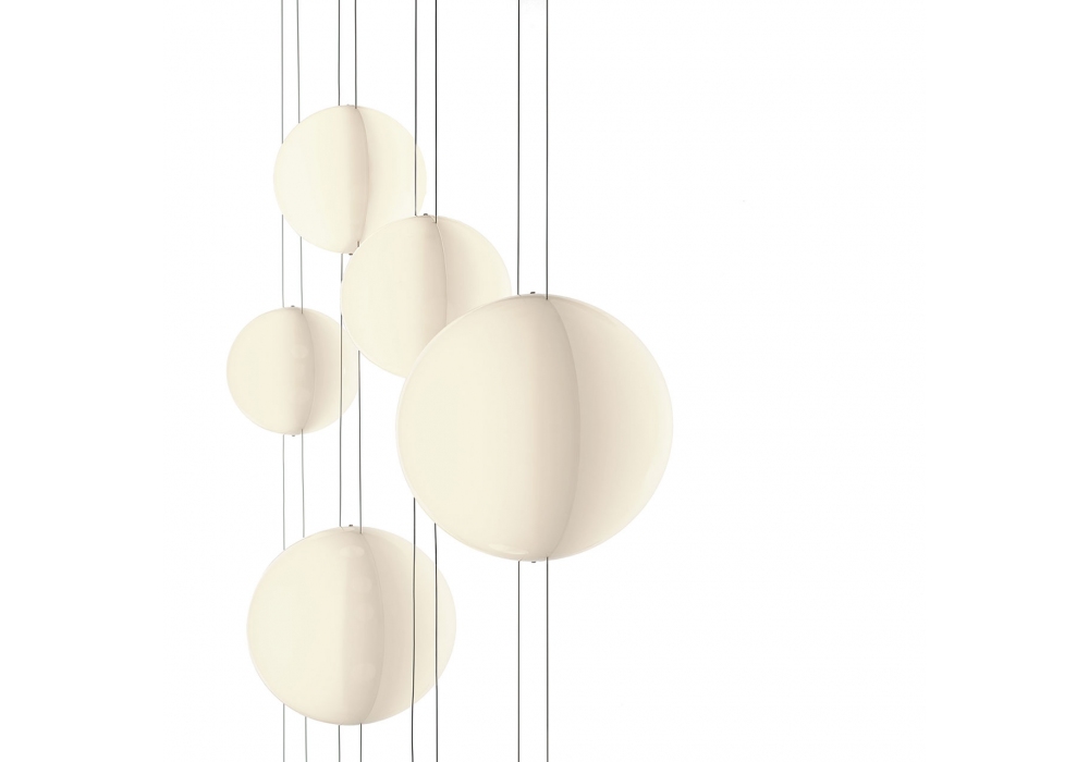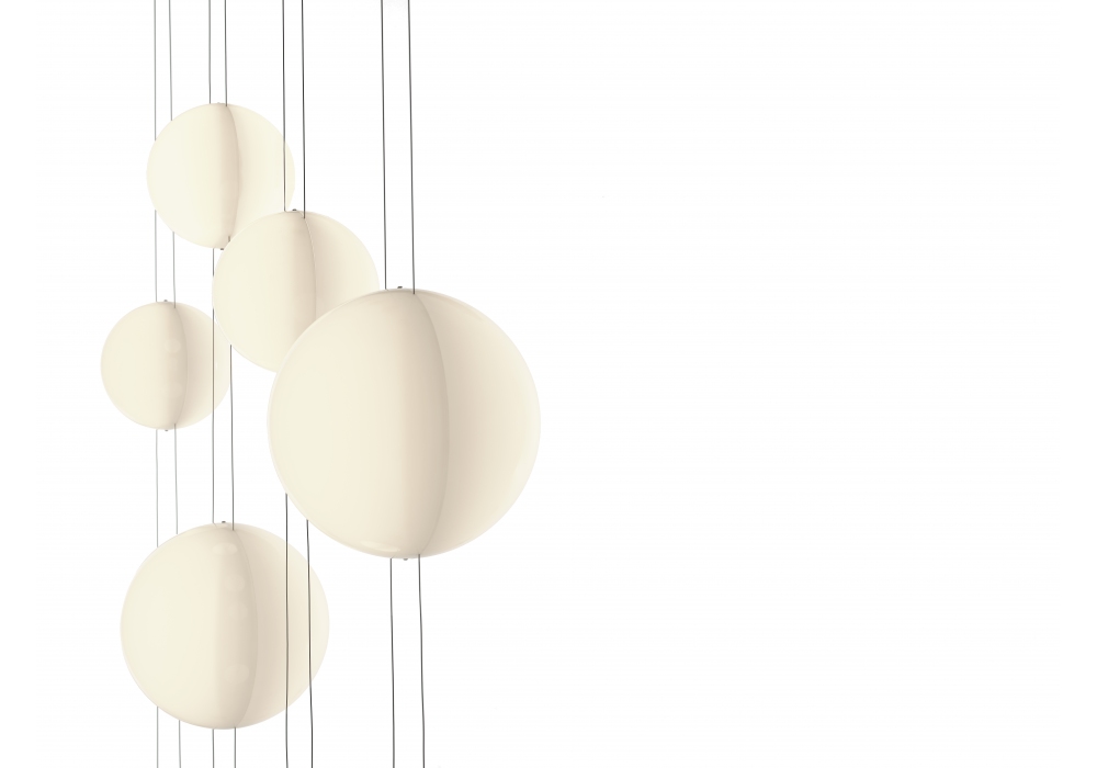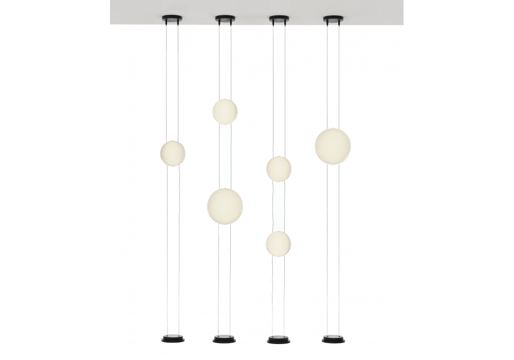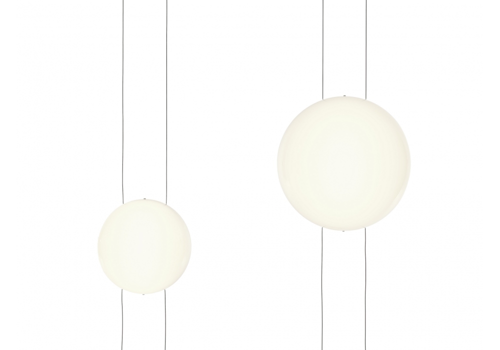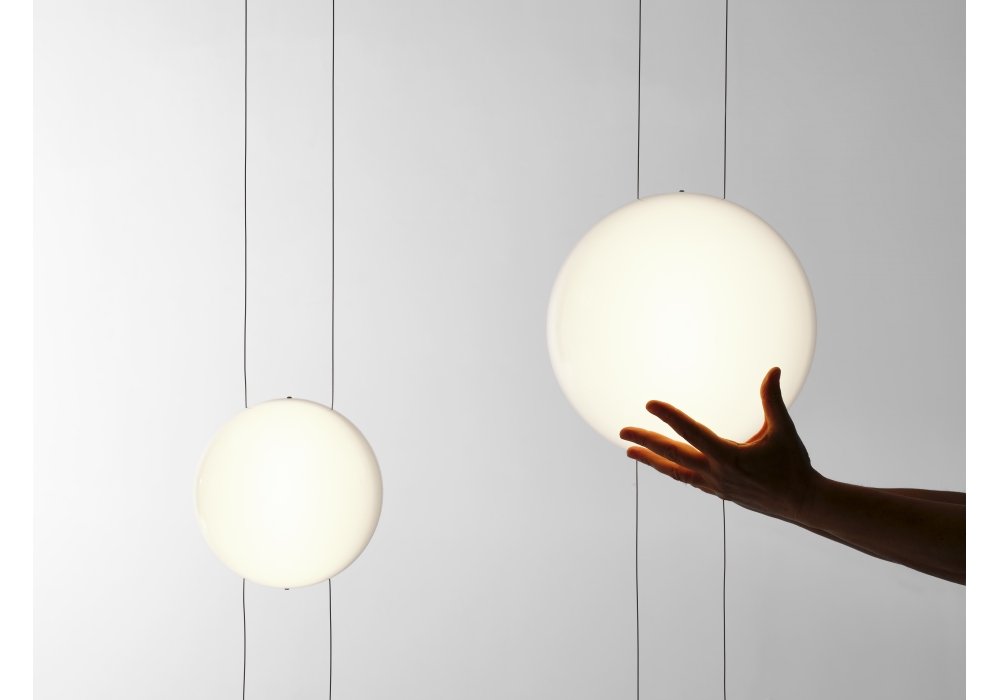 Orbit von Marco Cattaneo für Mogg entworfen, ist eine dimmbare Steh-Deckenleuchte mit kugelförmigem Diffusor, erhältlich in den Durchmessern 20 und 28 cm, die an parallelen Stahlkabeln gleiten. Erfordert eine Deckenbefestigung am gewünschten Ort. Kabellänge 400 cm. Es ist möglich, bis zu 3 kugelförmige Diffusoren für jede Struktur zu positionieren. Bodensockel und Deckenstütze schwarz lackiert RAL 9017.