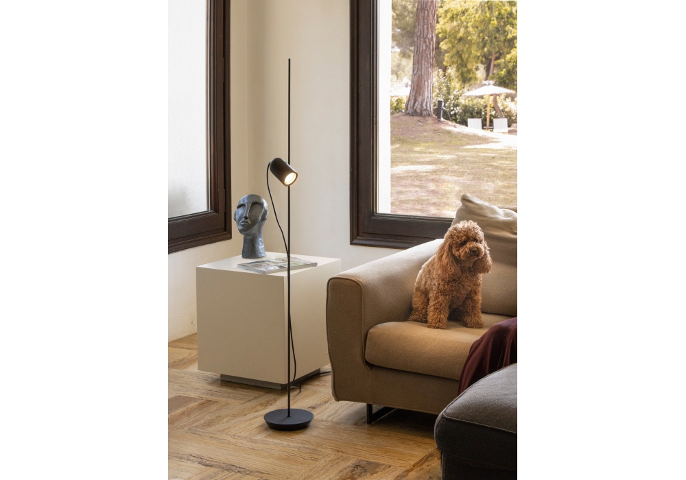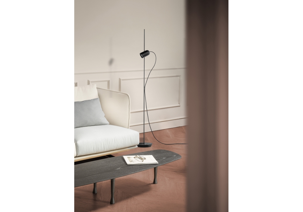 Onfa von Goula/Figuera Studio für Nomon entworfen ist eine Stehlampe mit vertikaler Metallstruktur und kreisförmiger Holzstruktur. Der Diffusor ist verstellbar, zylindrisch geformt und aus Holz mit Metalldetails gefertigt und verfügt über eine LED-Lichtquelle mit dimmbarem GU10-Einsatz. Onfa ist in verschiedenen Ausführungen erhältlich.