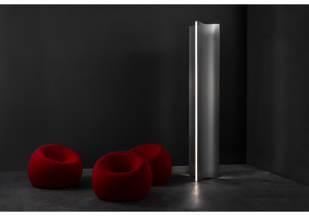 Stanley von Dodo Arslan für Terzani entworfen ist eine Stehlampe mit einer Tragstruktur, die vollständig aus gebürstetem Edelstahl besteht. Die Lichtquellen sind LEDs und in ein kabelloses Casambi-Dimmsystem integriert.