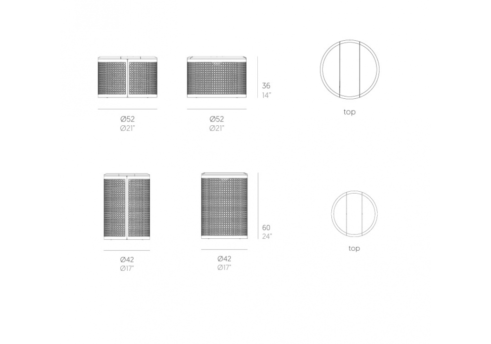 | Abmessungen | Ø 52 x H 36 cm; Ø 42 x H 60 cm. |