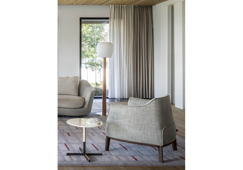 Nymph von Sebastian Herkner für Poltrona Frau entworfen, ist eine Stehleuchte mit einem Schirm aus geblasenem Glas mit gerippter Oberfläche. Der Leuchtenkörper besteht aus einem zylindrischen Rohr, in dessen Sockel sich ein LED-Modul befindet. Die Oberflächenstruktur des Zylinders verleiht dem Licht einen besonderen optischen Effekt. Der Sockel der Designer-Stehleuchte in Form eines Kegelstumpfes ist mit Pelle Frau® ColorSphere-Leder in verschiedenen Farben bezogen, mit Kontrastnähten und Messingmetalldetails. Die Leuchte wird per Touch-Ein/Aus über einen Messingknopf mit Modulationsdimmerfunktion eingeschaltet, um das Licht zu regulieren und auf verschiedene Lichtstärken einzustellen.