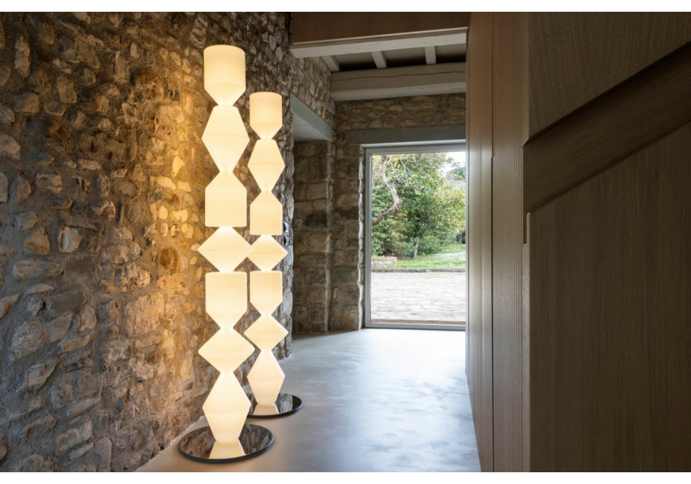 Costantina Opal von Nava + Arosio Studio für Mogg entworfen, ist eine Stehleuchte mit Metallstruktur und Lampenschirmen aus mundgeblasenem Opalglas.