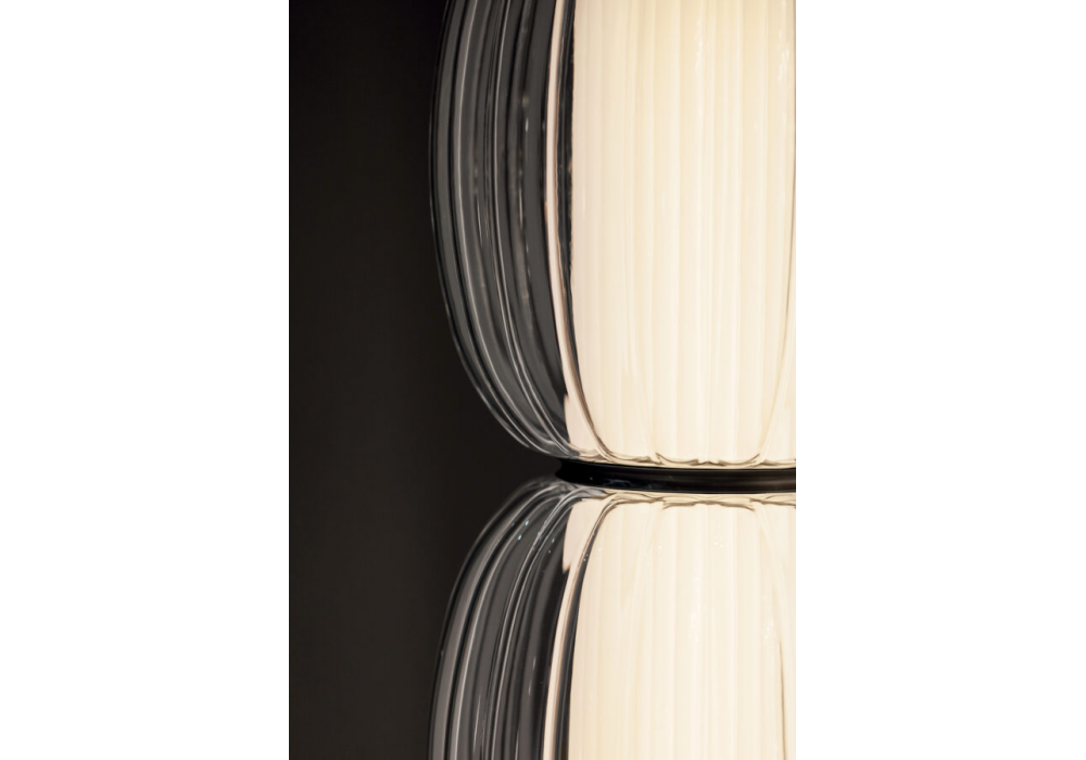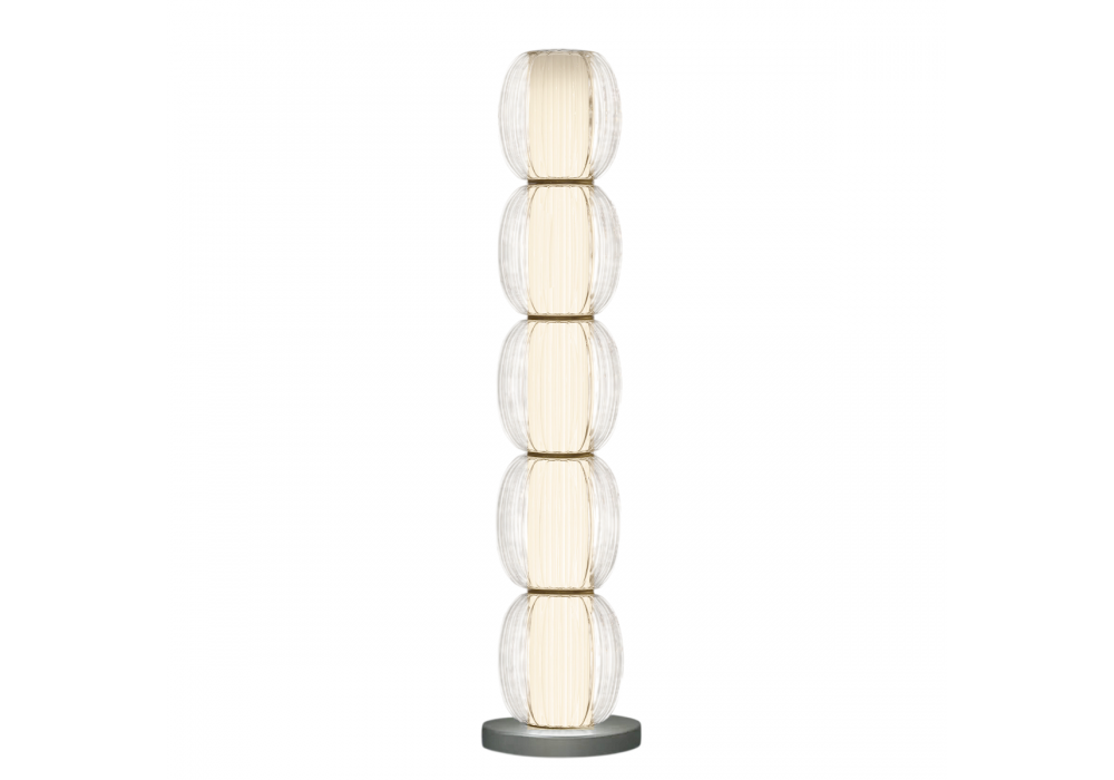 Alma von Controvento für Contardi entworfen, ist eine Stehleuchte mit champagnerfarbener Struktur, einem Diffusor aus transparentem Glas und einem Innendiffusor aus weißem Plissee-Stoff.