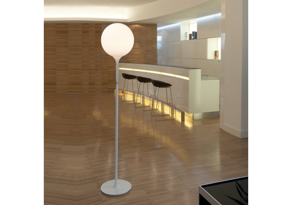 Castore 35 entworfen von Michele De Lucchi, Hubb Ubbens für Artemide ist eine Stehleuchte mit rundem Sockel aus Zamak und vertikalem Stiel aus weiß lackiertem Thermoplast. Der Diffusor ist kugelförmig und aus mundgeblasenem Glas gefertigt und schirmt eine LED-Lichtquelle ab.