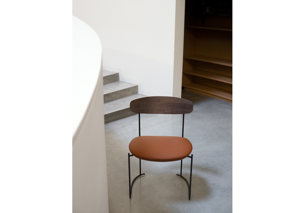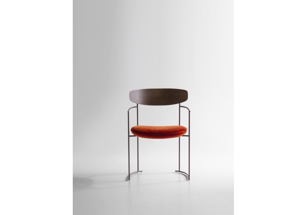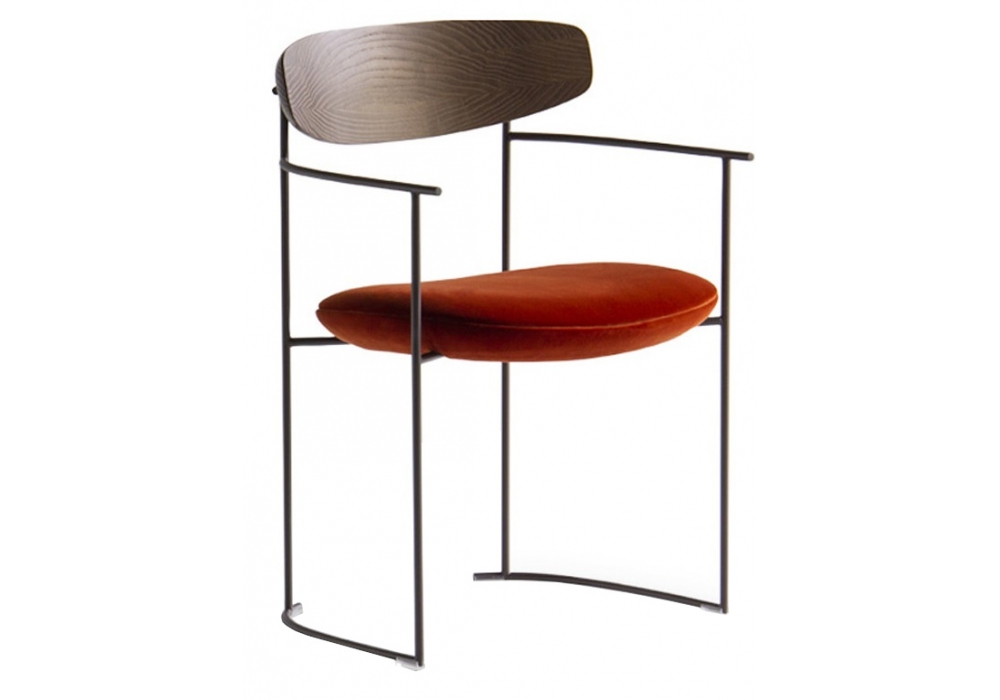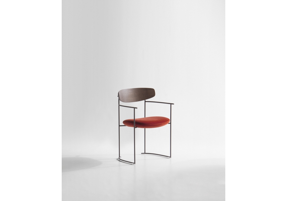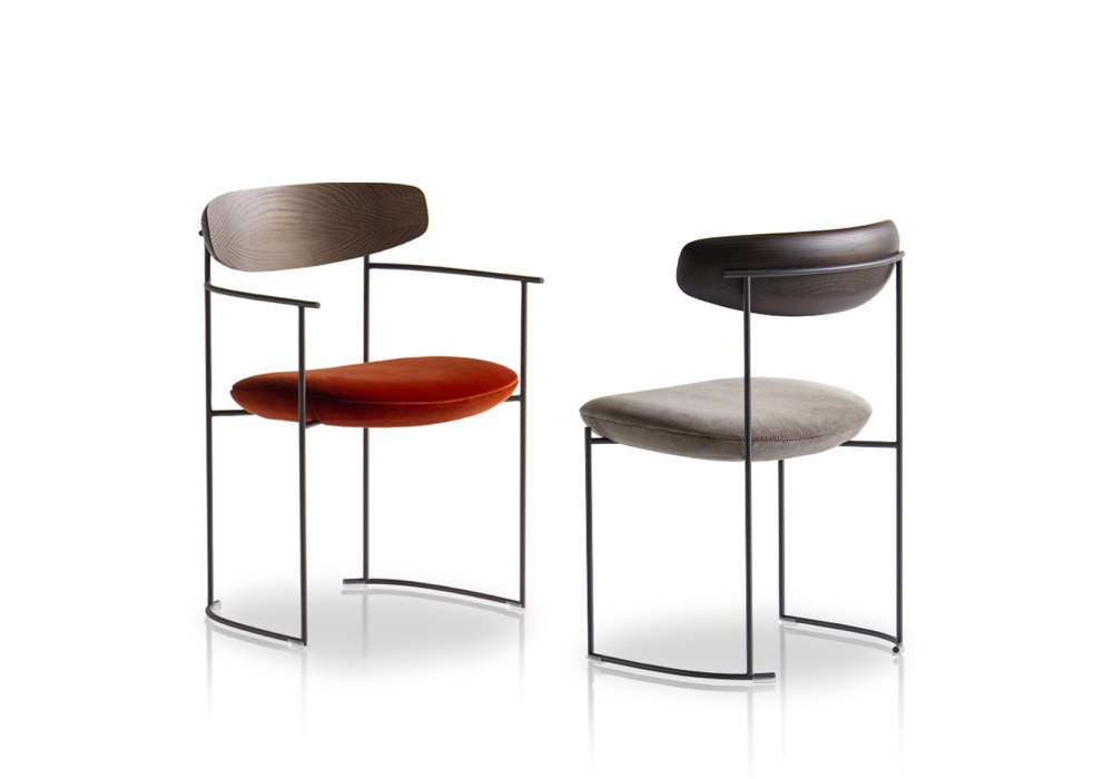 Keel von M + V für Potocco entworfen, ist ein Stuhl mit einer Struktur aus geprägtem, lackiertem Metallstab, einer Rückenlehne aus massiver Esche und einer Sitzpolsterung aus feuerhemmendem Polyurethanschaum mit Polsterung aus verschiedenen Stoffen, Leder oder Kunstleder.