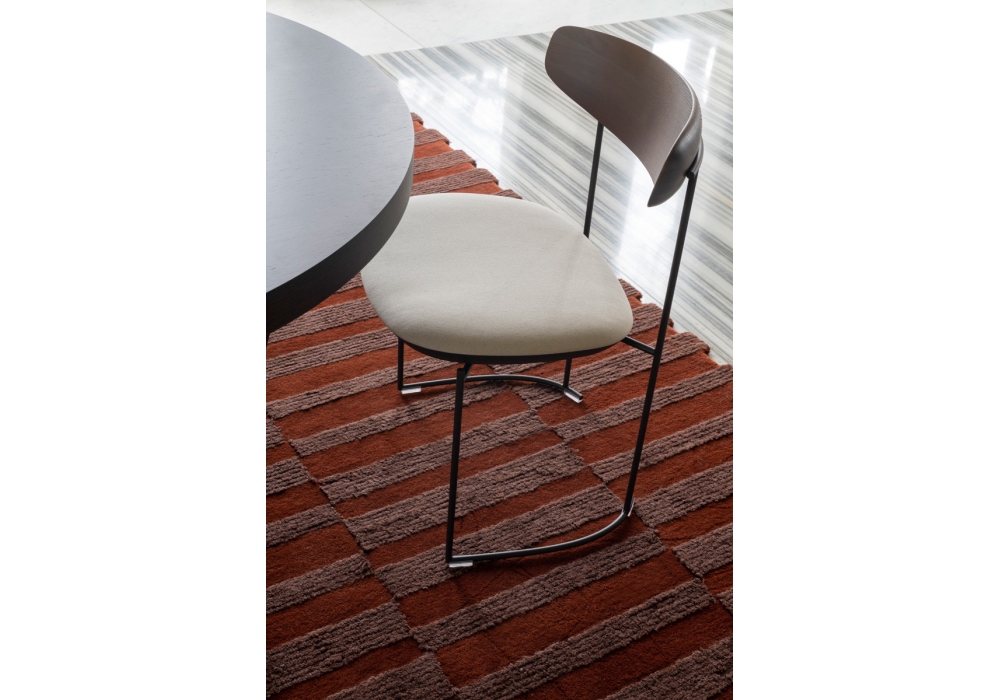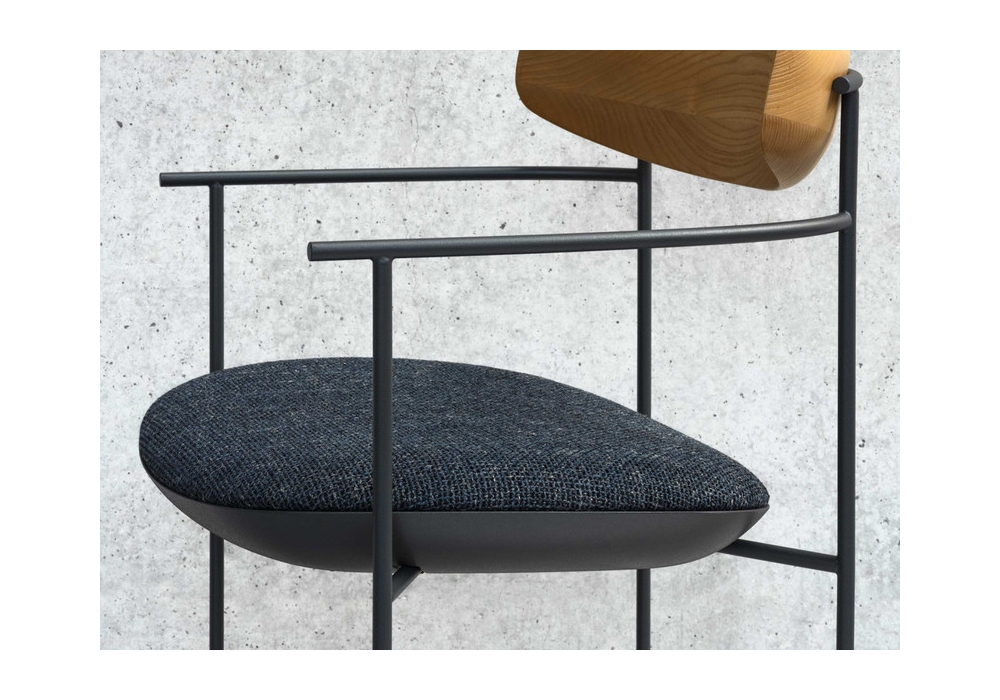 Keel Light von M + V für Potocco entworfen, ist ein Stuhl mit einer Struktur aus geprägtem lackiertem Metallstab, einer Rückenlehne aus massiver Esche und einer Sitzfläche aus Birkensperrholz, die mit feuerhemmendem Polyurethanschaum umwickelt ist und mit verschiedenen Stoffen, Leder oder Kunstleder bezogen ist.