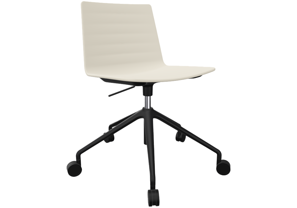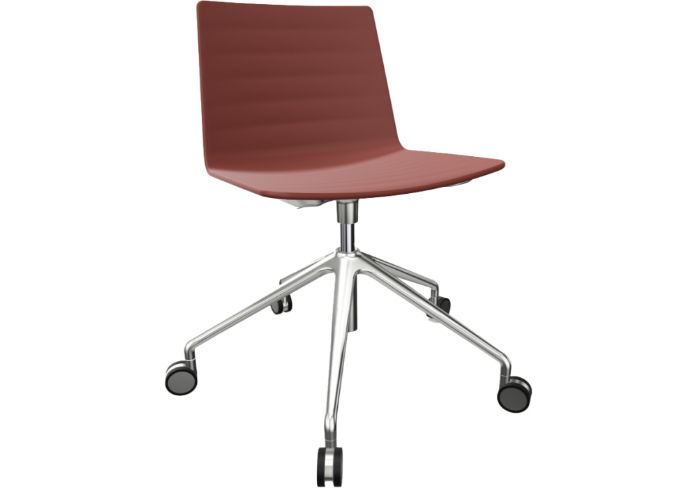 Flex Chair von Piergiorgio Cazzaniga für Andreu World entworfen ist ein Drehstuhl mit Thermopolymerschale in mehreren Ausführungen. Drehgestell mit 5 Rädern oder 4 Speichen aus Aluminium.